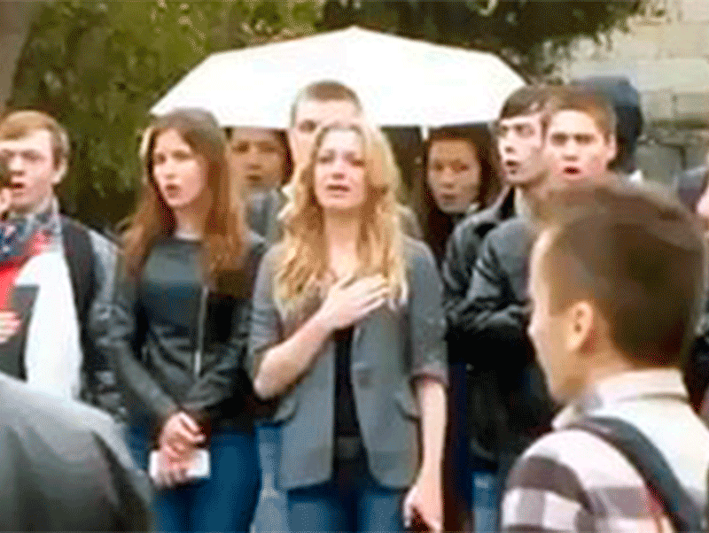 Під час подальшої процедури підйому російського прапора і виконання гімну РФ десятки студентів демонстративно покинули плац (на відео на 4 хвилині 25 секундах).