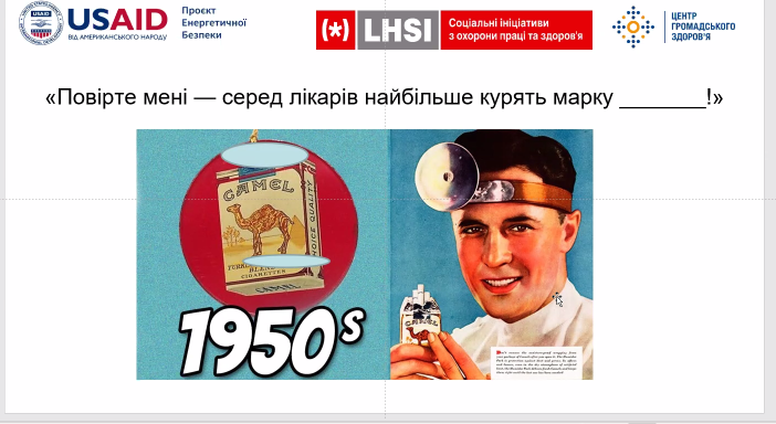 – У 1950-х було поширено багато неправдивої реклами на кшталт «Повірте мені – лікарі курять марку…( і далі назва)». Зараз також існує багато проплачених тютюнових кампаній. Крім того, виробниками тютюну використовуються різні «хитрощі», яким не надається розголосу, наприклад, вміщуються бронхолітики (розширюють легені, щоб більше втягувалося диму і швидше наставала залежність), використовуються різноманітні ароматизатори (для більшого задоволення), аміачні сполуки (пришвидшує реакцію мозку людини на нікотин), цукри та ацетальдегід (збільшує залежність) тощо».