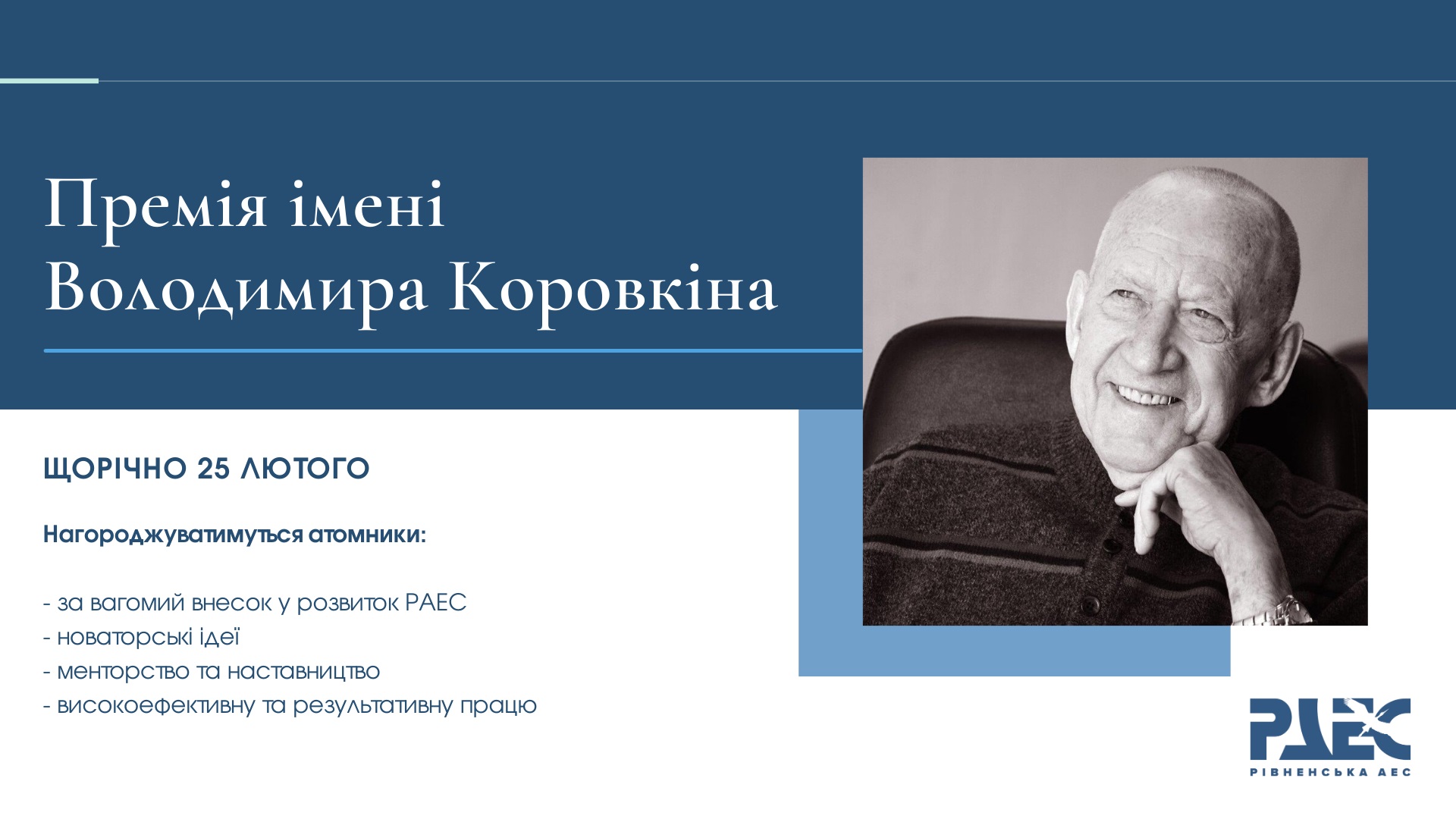 На РАЕС запроваджено унікальну Премію імені Володимира Коровкіна. Це - щорічна премія з метою вшанування пам’яті людини-легенди для усієї української атомно-енергетичної галузі, інженера, науковця Володимира Олександровича Коровкіна. Вручатиметься 25-го лютого щороку з нагоди дня народження атомника.