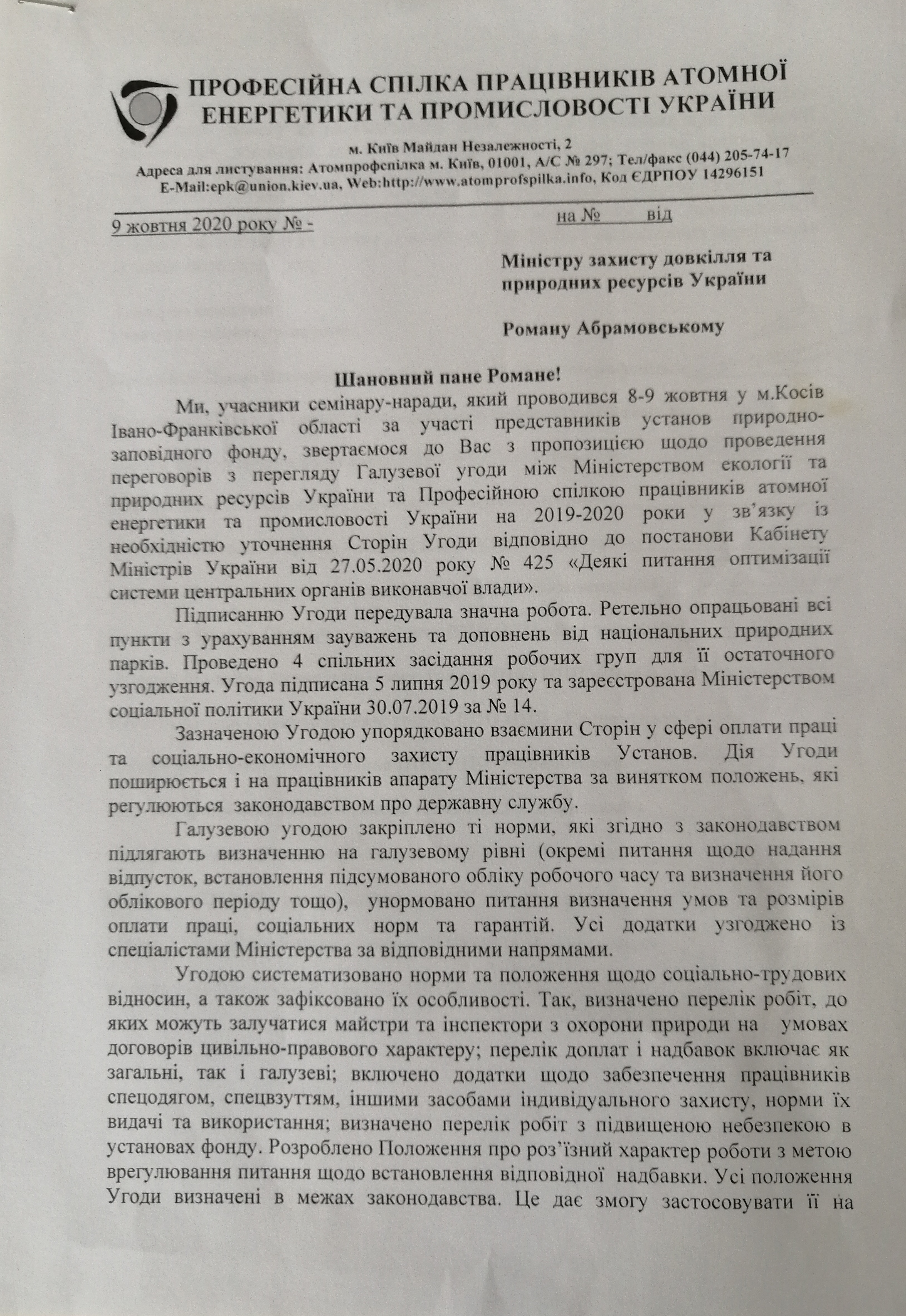 Учасники семінару-наради, який проводився 8-9 жовтня у м. Косів Івано-Франківської області за участі представників установ природно-заповідного фонду, звернулися до Міністра захисту довкілля та природних ресурсів України Романа Абрамовського з пропозицією проведення переговорів з перегляду Галузевої угоди між Міндовкілля та Атомпрофспілкою (на 2019-2020 роки) та пролонгації Угоди між Міністерством захисту довкілля та природних ресурсів України та Професійною спілкою працівників атомної енергетики та промисловості України на три роки з проведенням необхідної процедури колективних переговорів до кінця поточного року.