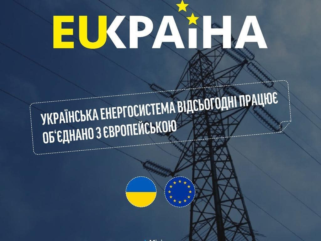 «Україна стала членом «енергетичного Євросоюзу». Завершилось об’єднання української та європейської енергосистем. Тепер наша електроенергія тече в ЄС, а європейська – в Україну. Дякую членам Євросоюзу, особисто Президенту Єврокомісії Урсулі фон дер Ляєн, Єврокомісару з питань енергетики Кадрі Сімсон і всім, завдяки кому в нас тепер єдина енергосистема», - зазначив Зеленський.