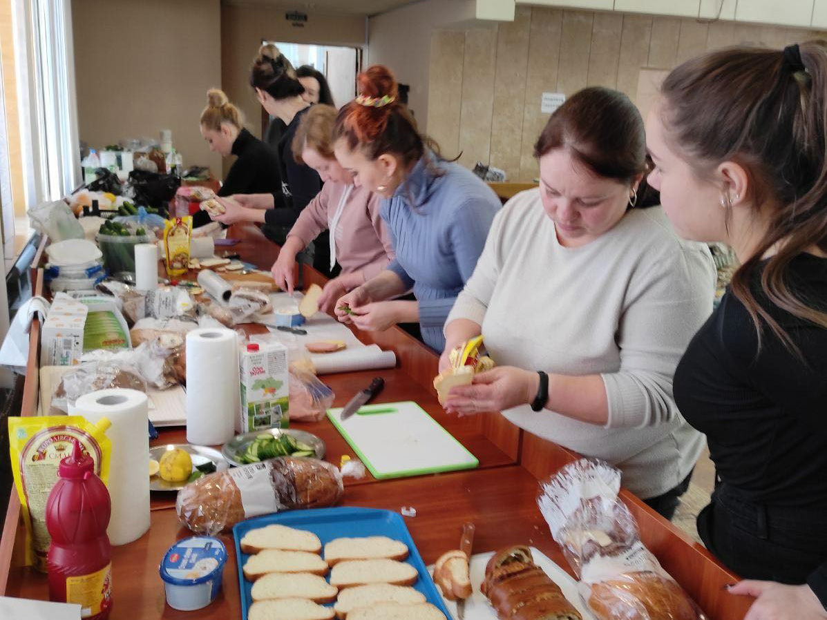 Особливо в суботу багато прийняли продуктів харчування, посортували, порозкладали. Упродовж цих днів забезпечили гарячим чаєм та кавою оборонців на блокпостах, у військкоматі, тих, хто зводив укріплення. Підгодовували бутербродами. Приготували їх небачену кількість! Десь взялися чайники, термоси, холодильник.