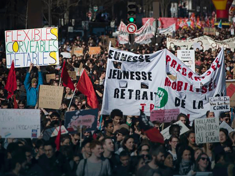 9, 17 и 24 марта более миллиона людей приняло участие в забастовках во Франции  против предлагаемого изменения трудового законодательства. Массовые акции были организованы национальными профсоюзными центрами CGT и CGT-FO совместно с другими организациями по всей стране, дабы противостоять навязываемым изменениям в трудовом законодательстве. «Идея, что ослабление трудового законодательства и эрозия фундаментальных прав работников позволит каким-то образом создать больше рабочих мест, попросту не работает», - заявила Генеральный секретарь ITUC Шаран Барроу. Граждане обеспокоены перспективой лишиться одного из главных благ социальной системы Пятой республики — 35-часовой рабочей недели.