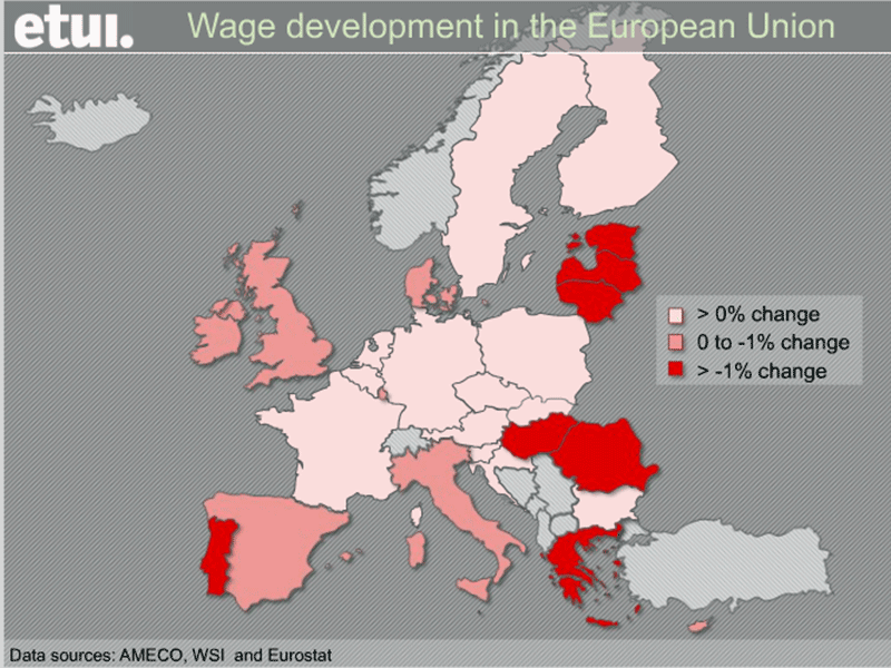 Европейский институт профсоюзов (ETUI)  представил новую инфографику, сравнивающую зарплаты в Европейском Союзе в период с 2000 по 2012 год. Для Европейской конфедерации профсоюзов (ЕКП) она иллюстрирует драматические последствия политики жесткой экономии в ЕС. За десять месяцев до выборов в Европарламент массовая безработица вместе с политикой урезания зарплат создает опасную смесь для поддержки гражданами европейского проекта как такового. ЕКП предупреждает европейских лидеров о том, что необходимы срочные изменения направления внутренней политики для восстановления экономического роста и доверия.