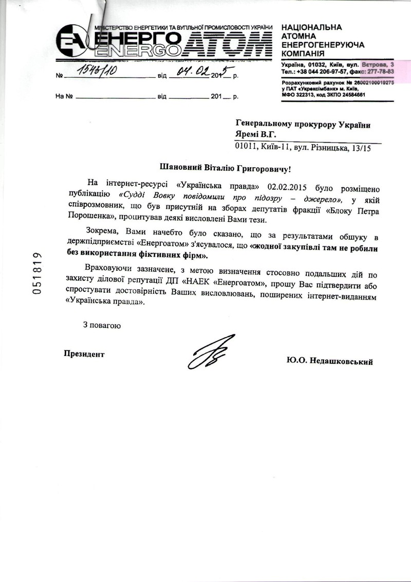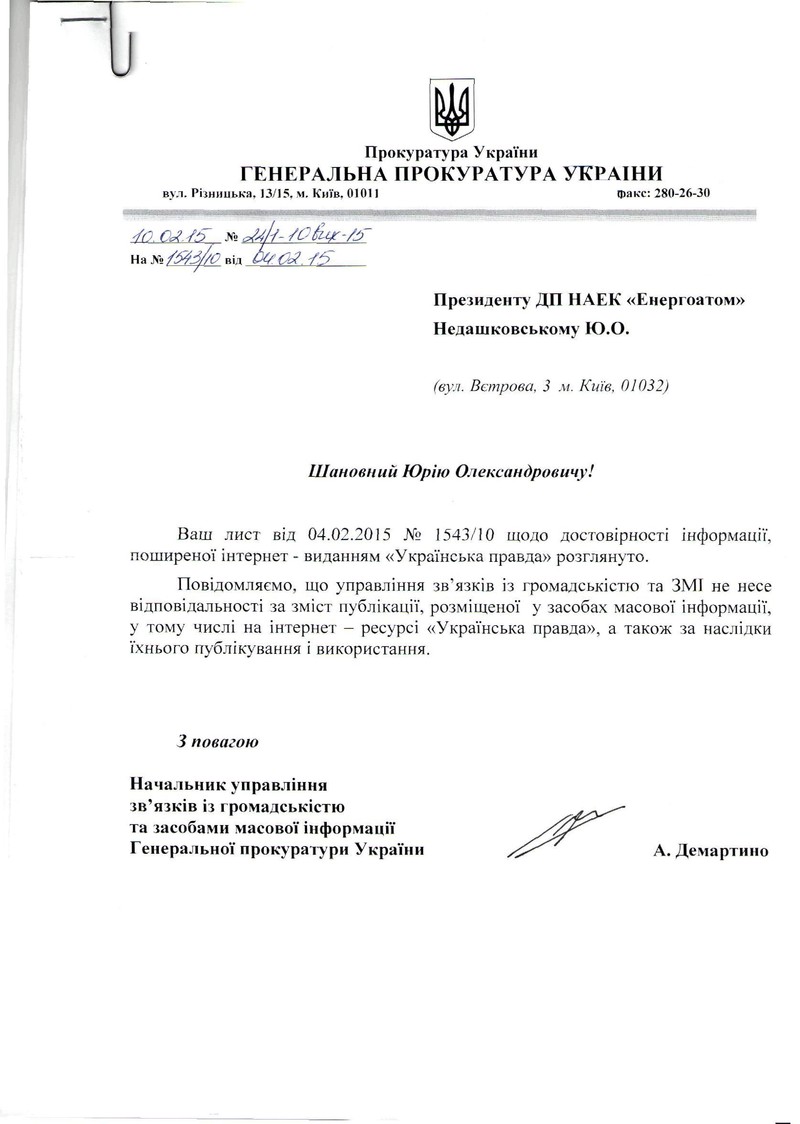 Зокрема, у відповідь на прохання прокоментувати публікацію «Української правди» від 2 лютого 2015 року, згідно з якою В. Ярема заявив, що «в результаті обшуку у держпідприємстві «Енергоатом» з'ясувалося, що жодної закупівлі там не робили без використання фіктивних фірм», управління зв'язків з громадськістю та засобами масової інформації Генпрокуратури заявило: «... щодо достовірності інформації, поширеної інтернет-виданням «Українська правда»... Повідомляємо, що управління зв'язків з громадськістю та ЗМІ не несе відповідальності за зміст публікації, яку було розміщено в ЗМІ, у тому числі на інтернет-ресурсі «Українська правда», а також за наслідки її публікації та використання».