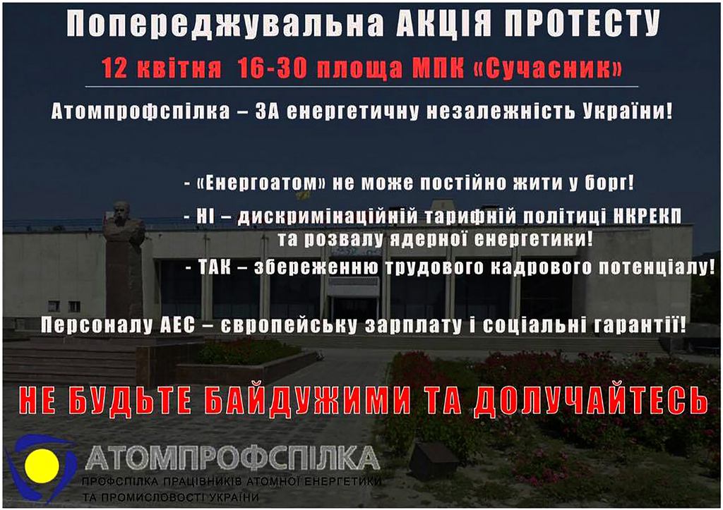 Про тривожне становище в атомно-енергетичному комплексі країни, що може призвести до його руйнації, розкажуть: Голо-ва Атомпрофспілки України Валерій Матов і його заступник–голова профспілкового комітету ППО ДП НАЕК «Енергоатом» Олексій Лич. В унісон брифінгу лідерів Атомпрофспілки України у восьми містах-супутниках атомних регіонів у межах 16.00–18.30 проходитимуть попереджувальні акції протесту. на виконання від-повідної постанови Президії Центрального комітету профспілки від 22 березня 2018 року №П-5-15, з вимогою примусити органи державної влади за столом переговорів обговорити шляхи розв’язання нагальних питань стратегічної ядерної галузі.