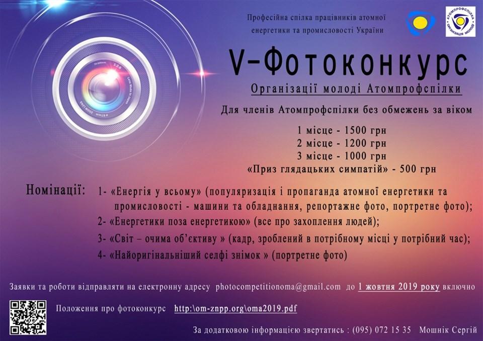 Організація молоді Атомпрофспілки запрошує взяти участь у V-фотоконкурсі. Конкурс проводиться для всіх членів Атомпрофспілки. Вікові обмеження у фотоконкурсі відсутні.