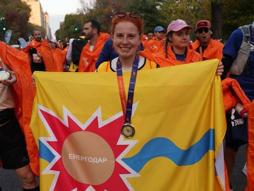 Разом з іншими учасниками марафону Яніна пробігла дистанцію, тримаючи прапор свого рідного міста, яке сьогодні залишається в окупації.