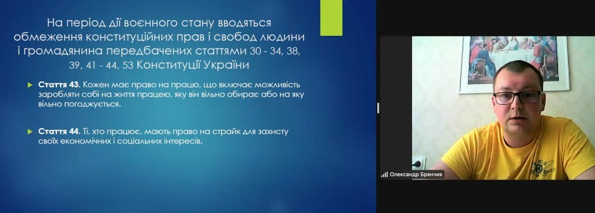 Це чергова тема курсу лекцій онлайн навчання «Профспілкова абетка» для новообраних профспілкових лідерів, що відбулося у рамках освітнього проєкту «Колегіум Атомпрофспілки» 25 травня 2023 року. Юрист відділу колективно-договірної та правової роботи ЦК Атомпрофспілки Олександр Брянчик (ХАЕС, м. Нетішин) розповів про нові правила трудових відносин, особливості правового регулювання під час воєнного стану.