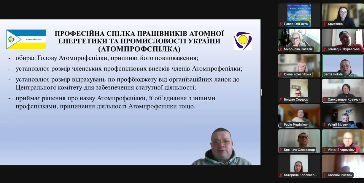 Завідувач відділу організаційної роботи ЦК Атомпрофспілки Сергій Голота докладно розповів про організаційну структуру Атомпрофспілки. Будується вона на основі добровільного об’єднання первинних профспілкових організацій, які діють у межах повноважень, наданих Статутом Атомпрофспілки (в якому містяться положення, що стосуються особливостей створення та функціонування профспілки) та законодавством України.