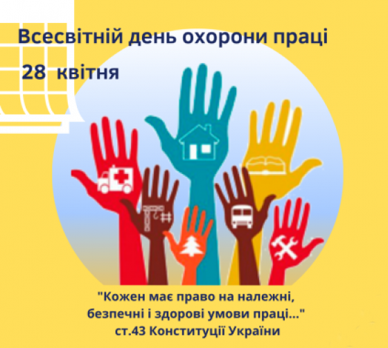Щороку 28 квітня за ініціативою Міжнародної організації праці країни світу відзначають Всесвітній день безпеки та здоров’я на роботі, вибираючи актуальну тему, пов’язану з безпекою та здоров’ям працівників на роботі.