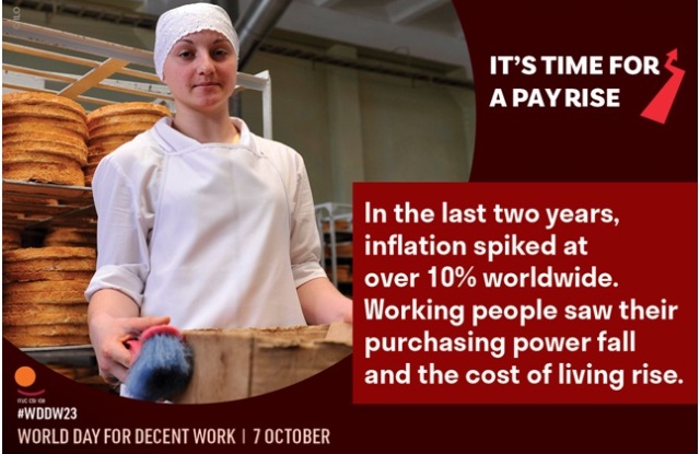 7 жовтня, у Всесвітній день боротьби за гідну працю, МКП закликає "Настав час для підвищення заробітної плати", щоб зменшити величезний тиск на працюючих людей та їхні сім'ї через інфляцію, спричинену прибутками корпорацій.