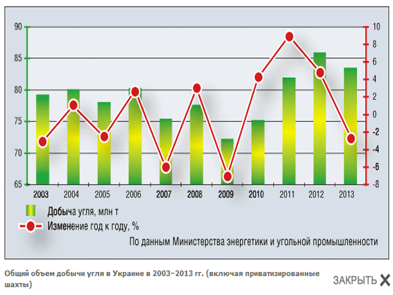 В период с 2005-го по 2009 год объем добычи угля в Украине постепенно сокращался, однако с 2010-го — вновь начал расти. Объем импорта, по данным Миндоходов, в 2012 году также вырос на 16,2% (по сравнению с 2011-м) — до 14,8 млн тонн. В 2012 году в стране оказалось 100,746 млн т угля. Но уже в I квартале 2013-го отрасль столкнулась с проблемой реализации производимой продукции и до сих пор ее не решила.