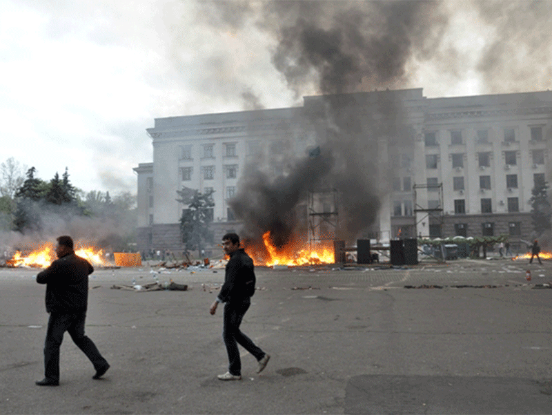 «Обмін» запальними сумішами призвів до займання барикади із шин, спорудженої перед входом до Будинку профспілок. Від сильного полум’я загорілися вхідні двері будівлі, і саме в той момент, коли вони практично повністю згоріли, стався головний момент трагедії, що забрав життя майже півсотні людей...